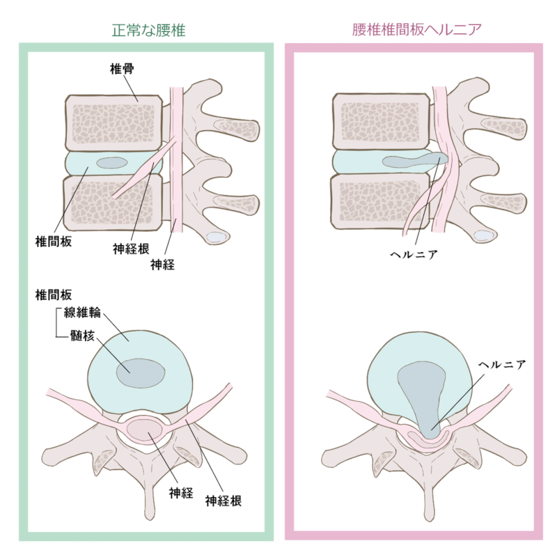 飛び出した椎間板が神経を圧迫することにより腰や足の痛み・しびれを発症すると言われています。